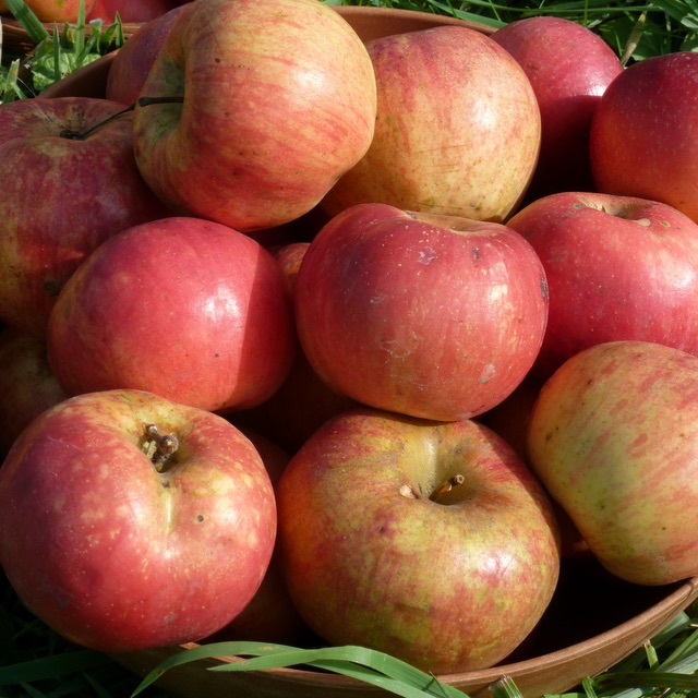 +*Cox’s Orange Pippin: a classic English apple, it was discovered in 19th century England. Does well in cider, pies, butter and sauce, as well as for eating fresh. Red spread over underlying yellow gives the apple an orangish color. A grandparent of Gala, it is very juicy. Good for eating, baking, sauce and butter, as well as in hard cider.